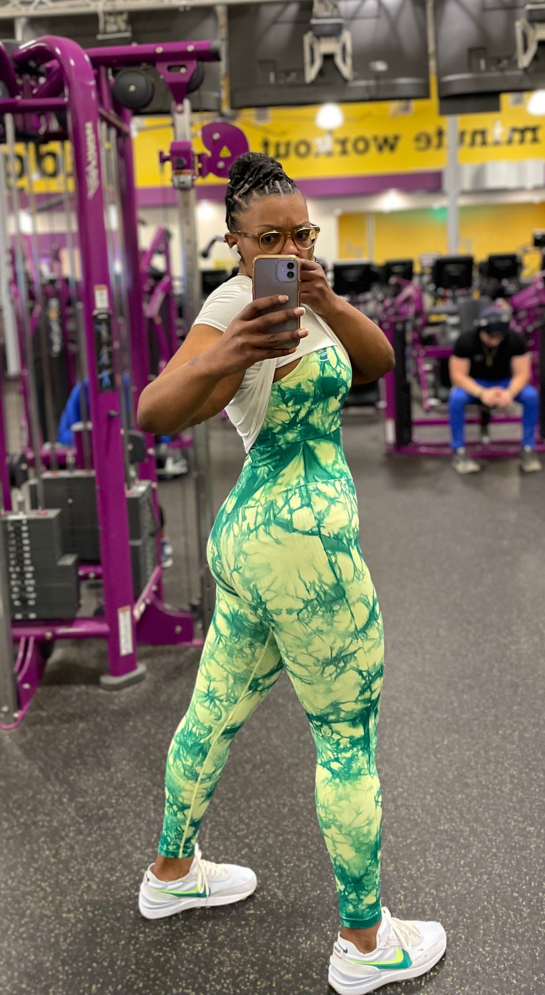This ribbed set is super cute. The high-waisted leggings are perfect for providing more coverage. The double strap sports bra will show off that sculpted back!